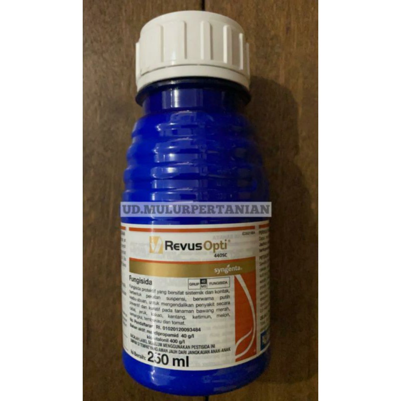 Fungisida REVUS OPTI 440 SC isi 250 ml dari SyngentaBahan Aktif : Mandipropamid 40 g/lKlorotalonil 400 g/lFungisida protektif yang bersifat sistemik dan kontak, berbentuk pekatan suspensi, berwarna putih keabu-abuan, untuk mengendalikan panyakit secara preventif dan kuratif pada tanaman bawang merah, cabe, jeruk, kakao, kentang, ketimun, melon, semangka, tembakau & t