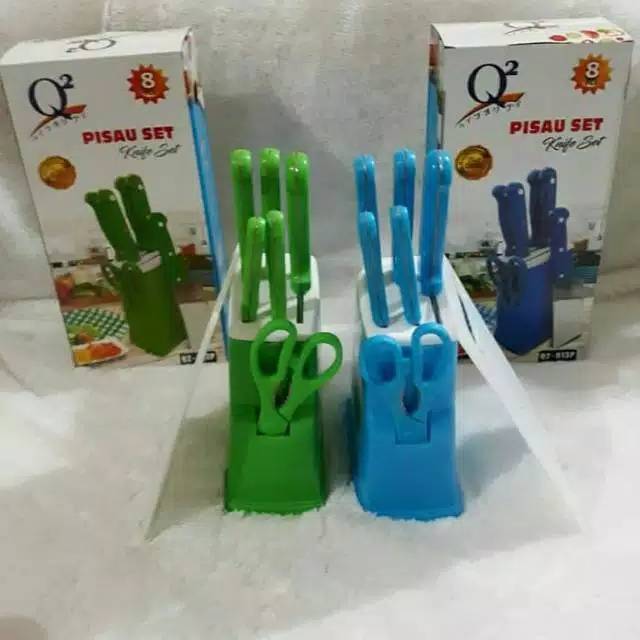 Knife set q2Bahan : Perpaduan Stainless Steel + PlastikUkuran Karton : 17 x 10 x 35.5 cm (P x L x T)Isi dalam 1 paket 8 Pcs :6.5" Chopper : 1 Pcs8.0" Chef's Knife : 1 Pcs6.5" Bone Knife : 1 Pcs5.0" Utility Knife : 1 Pcs3.5" Paring Knife : 1 PcsKitchen Scissors : 1 PcsPlastic Cutting Board : 1 PcsPlastic Wooden stand : 1 PcsTersedia Warna Pilihan :1. Biru2. HijauMohon tuliskan pilihan warna pada kotak keterangan, Apabila warna yang diminta tidak ada/anda tidak menuliskan keterangan warna maka kami akan mengirimkan warna Random (warna acak). Terima kasih :)100% Terlindung dari bahan kimia yang berbahaya. Bahan tebal dan kuat, praktis, Tahan panas dan dingin, Harga terjangkau, Premium Qua